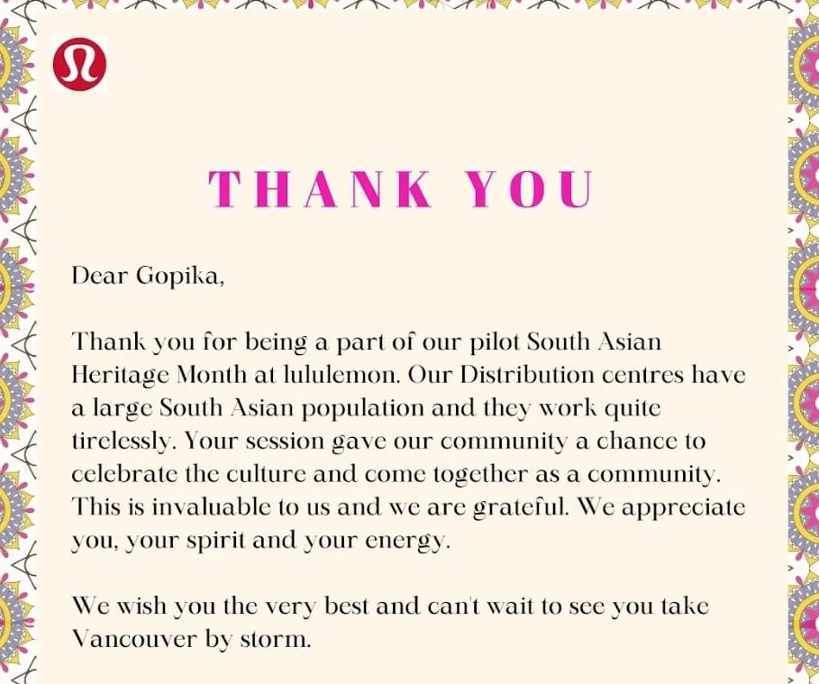 Gopika celebrates every festival with unique themed classes and leads annual community events including Canada Day, Surrey Fusion Festival, and charity Zumbathons. In 2023, she was recognized as Fitness World's Instructor of the Year.